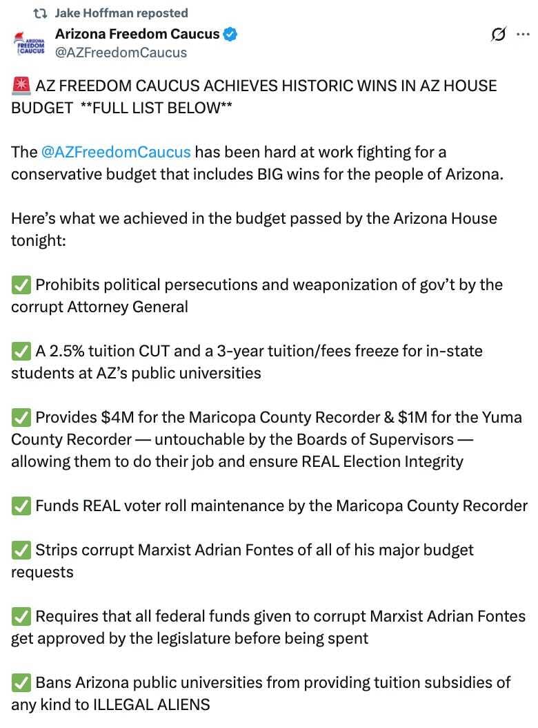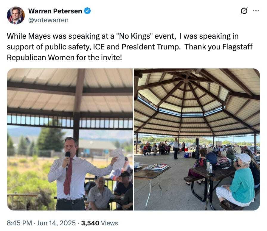 Not MAGA enough: As we mentioned above, Maricopa County Recorder Justin Heap is suing the county supervisors amid a long-running dispute over who gets to run elections, the Phoenix New Times’ Zach Buchanan reports. Heap, a die-hard MAGA guy, wants the GOP-controlled board of supervisors to provide more funding and return control of the IT system to the Recorder’s Office. He says the supervisors are blocking him from delivering the “honest” elections he promised on the campaign trail. The supervisors pointed to Heap’s "irresponsible and juvenile ready-fire-aim approach to governance.” Behind the scenes, the lawsuit is backed by America First Legal, which was founded by Stephen Miller, a deputy chief of staff at the White House (and architect of the ICE raids you’ve been seeing in the news lately), the Associated Press reports. But America First Legal might not be allowed to represent Heap. Maricopa County Attorney Rachel Mitchell wrote a cease and desist letter saying she is the attorney for all elected officers in the county, VoteBeat’s Jen Fifield reports.