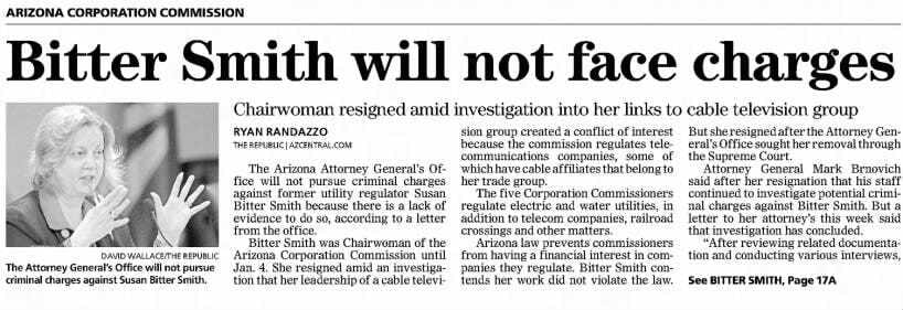 Commissioner Susan Bitter Smith resigned in 2015 after an attempted ouster by then Attorney General Mark Brnovich over conflict of interest concerns. Bitter Smith, making an $80,000 salary as a commissioner, was simultaneously a registered lobbyist for Cox Communications and earning $150,000 a year as the longtime executive director and lobbyist of Southwest Cable Communications Association, a nonprofit with multiple cable companies as dues-paying members.