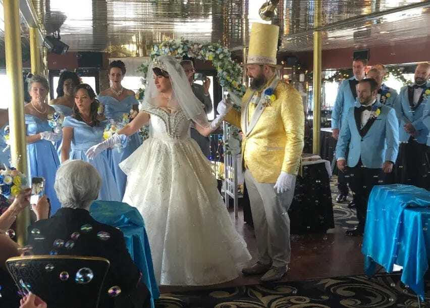 Hamilton, best known for her work on the grassroots MAGA organization EZAZ, wore a “taxation is theft” themed dress while the groom wore one heck of a shiny gold suit and top hat for their shindig, which was held in the “Gulf of America.”