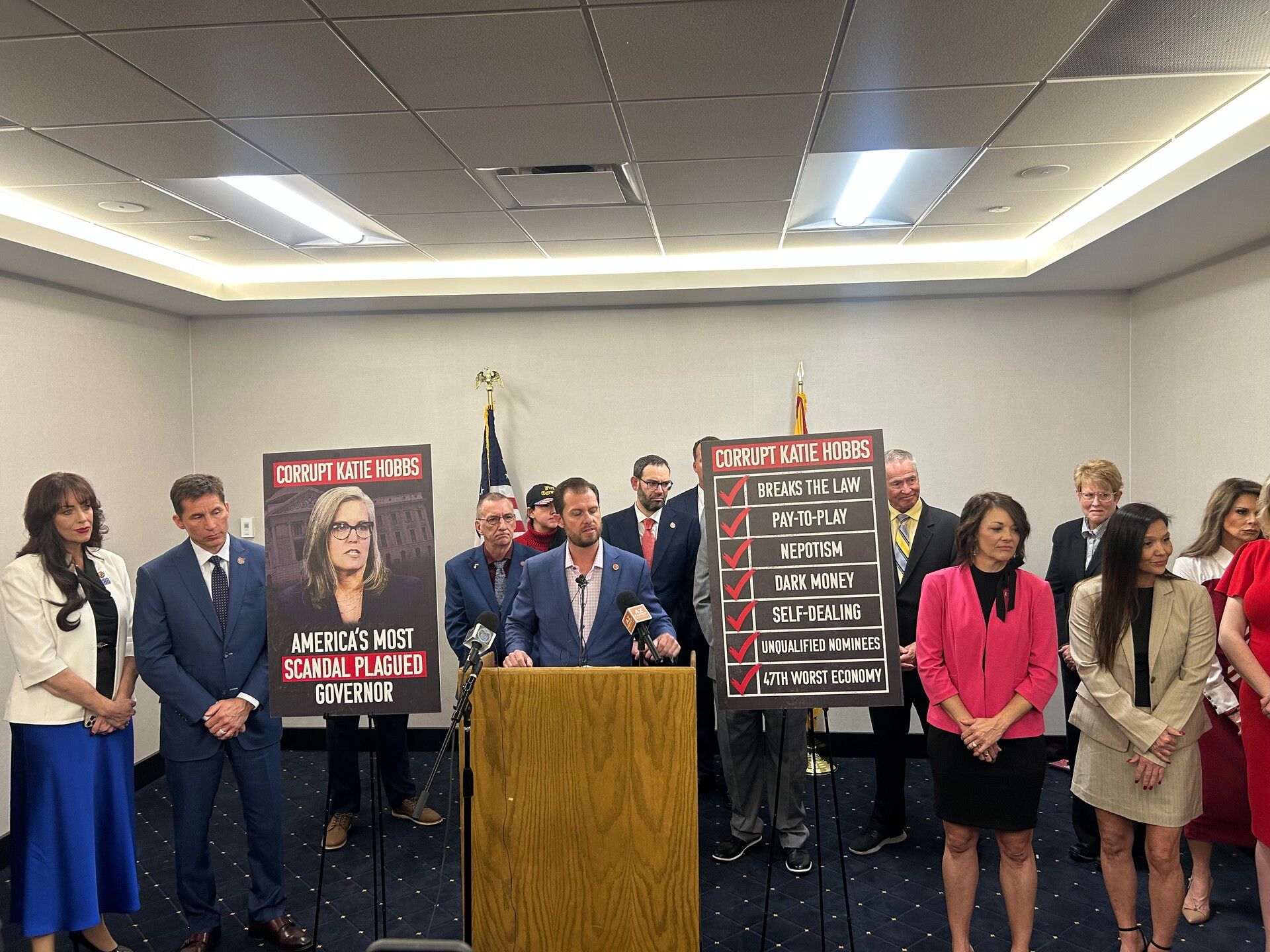 Republican lawmakers and friendly candidates in this year’s cycle were flanked by signs calling Hobbs corrupt and declaring her “America’s most scandal plagued governor.” (Perhaps the sign was printed well before Minnesota’s Democratic Gov. Tim Walz began getting bashed by the GOP over a child care fraud scandal unfolding in his state.)