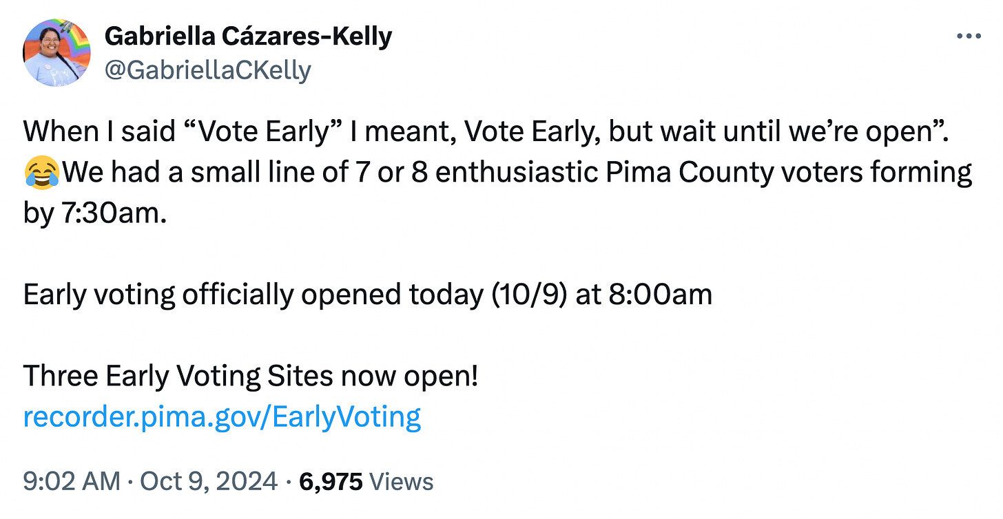 Let the games begin: All of Arizona’s counties passed the Secretary of State’s voting tests, which ensures county equipment will accurately tally votes ahead of the November elections, per KJZZ’s Wayne Schutsky. The Maricopa County Republican and Democratic parties signed off on the results. Meanwhile, Pima County reached a record number of active registered voters after an influx of last-minute registrations last week, bringing the total to more than 655,000, about 12,000 more registered voters than in 2020, AZPM’s Hannah Cree reports.