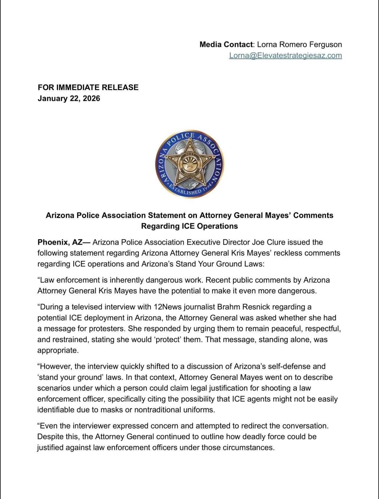 “As Arizona’s top law enforcement officer, I want to remind all federal agents of my expectations for them in our state: respect the law, do not mask, deescalate violence when possible and stay OUT of schools, hospitals, and churches.”