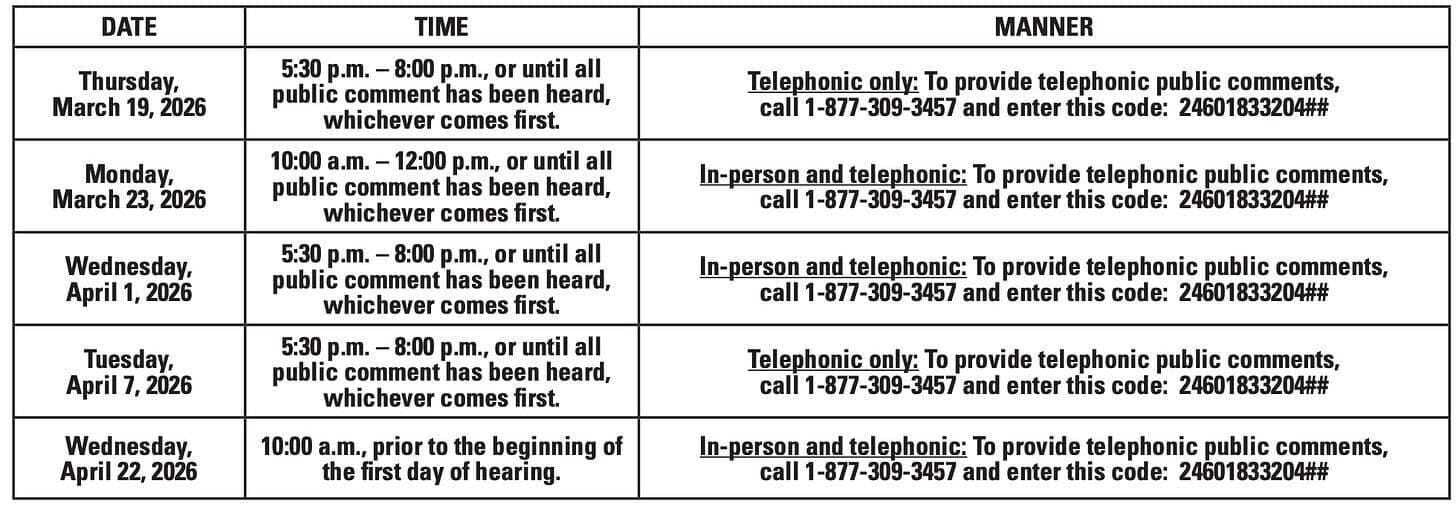 Here are the commission’s public comment meeting dates for the APS rate case. The in-person meetings are at 1200 W. Washington St in Phoenix.
