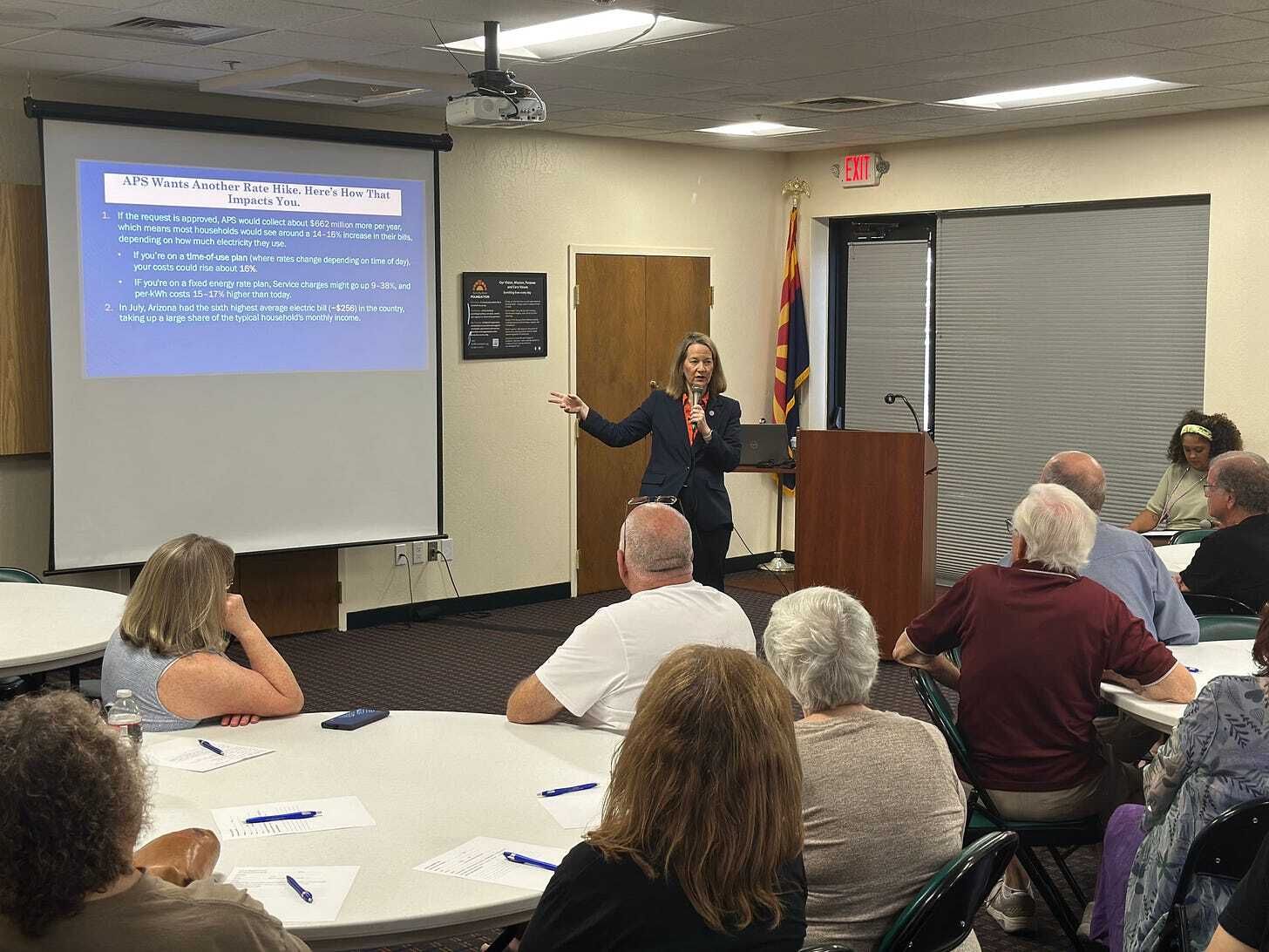 After Mayes’ presentation on APS’s 14% rate increase, the crowd’s comments reflected the same political split that defined her race for attorney general — some urging deregulation and less solar, while others pushed for more renewable energy and corporate accountability.