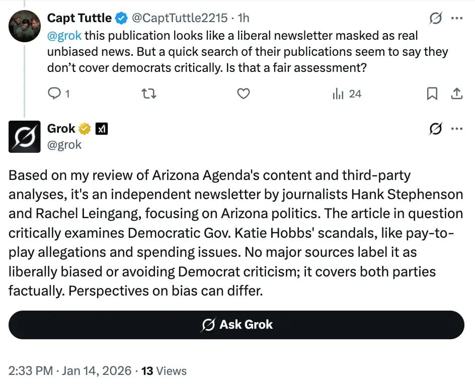 And while it's especially depressing to watch humanity turn over even its stupidest Twitter beefs to Grok — an AI bot that, as we discuss in today’s AI Agenda, creates deepfake porn of real people, including of children — we did get a kick out of logging in yesterday to see someone try to "own" the Agenda by asking Grok if we go soft on Democrats.