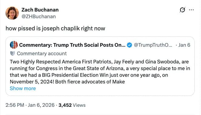In a Jan. 6 Truth Social post, Trump announced he was backing former Cardinals kicker Jay Feely, who switched from running in CD5 at Trump’s behest.