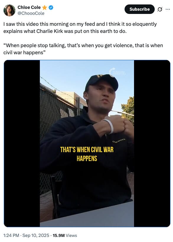 Since the shooting, pundits who used to deride Kirk’s politics are now lavishing him with praise for talking to people who disagreed with him. The New York Times’ Ezra Klein, for example, said Kirk was “practicing politics in exactly the right way.”