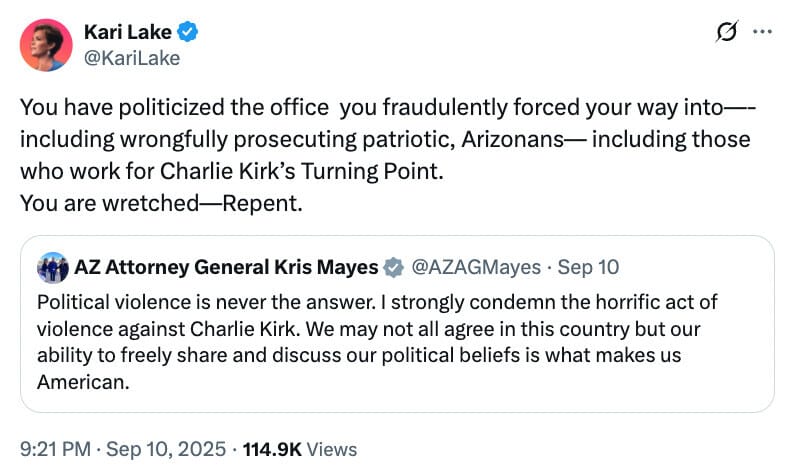 And Kari Lake told Arizona Attorney General Kris Mayes to “repent” for prosecuting Turning Point executives, like Chief Operating Officer Tyler Bowyer, in the fake electors case.