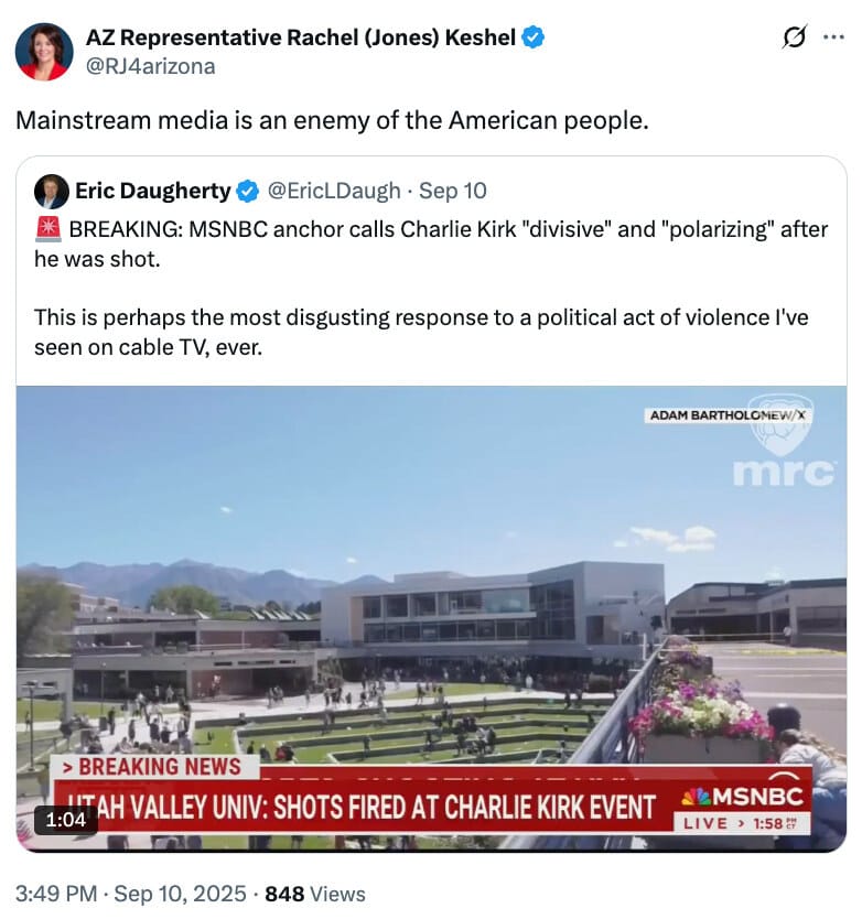 Republican state Rep. Rachel Keshel announced, “The Democrat party is dead,” and joined Libs of TikTok in outing the workplaces of people for offenses ranging from criticizing Kirk’s rhetoric to celebrating his death.