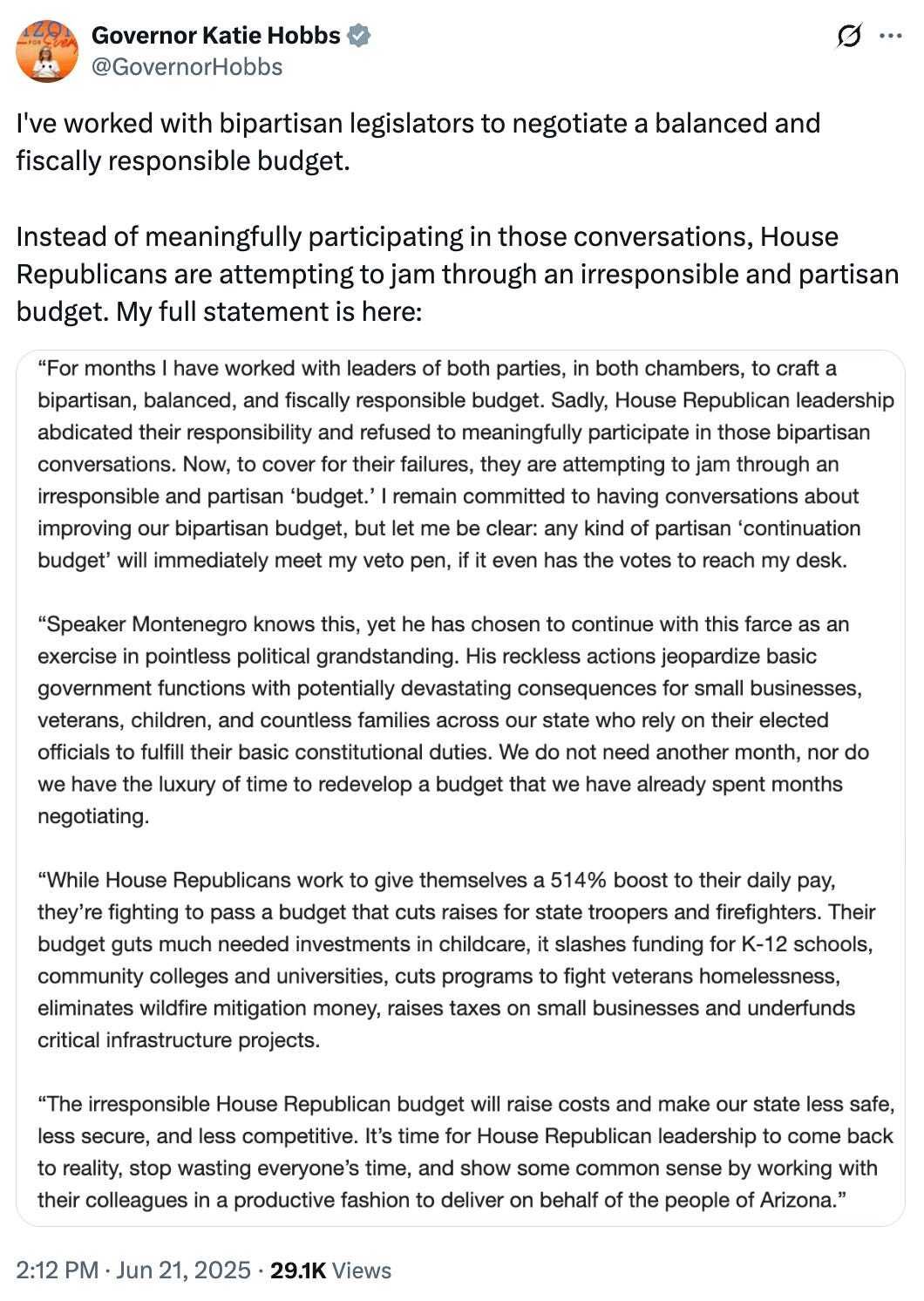Gov. Katie Hobbs confirmed she’ll veto the House “continuation” budget, and she took some heavy swings at Montenegro, saying his team refused to engage in negotiations and now they’re threatening to shut down the government.