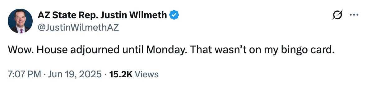 Welcome to dystopia: After President Donald Trump bombed three Iranian nuclear facilities Saturday and forced the United States into war in the Middle East without congressional approval, Arizona’s Republican political players say to “trust” the president, while Democrats like U.S. Sen. Ruben Gallego want evidence on why the bombings were necessary, the Republic reports. Our sister ‘sletter, the Tucson Agenda, dives into the candidate reactions in the Congressional District 7 race. Meanwhile, U.S. Rep. Yassamin Ansari, whose family fled Iran during the 1979 revolution, wants her congressional colleagues to vote on the War Powers Resolution to rein in Trump’s military powers. And on Sunday, the Department of Homeland Security warned of a “heightened threat environment” in the U.S.