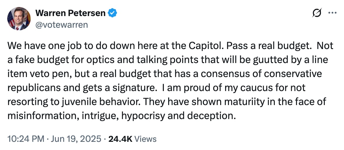 Senate President Warren Petersen accused Montenegro of “throwing a temper tantrum.” Then he threw his own tantrum by adjourning the Senate “sine die,” meaning for the final time this year, after the Senate had finally completed its business around 2 a.m. Friday morning.1