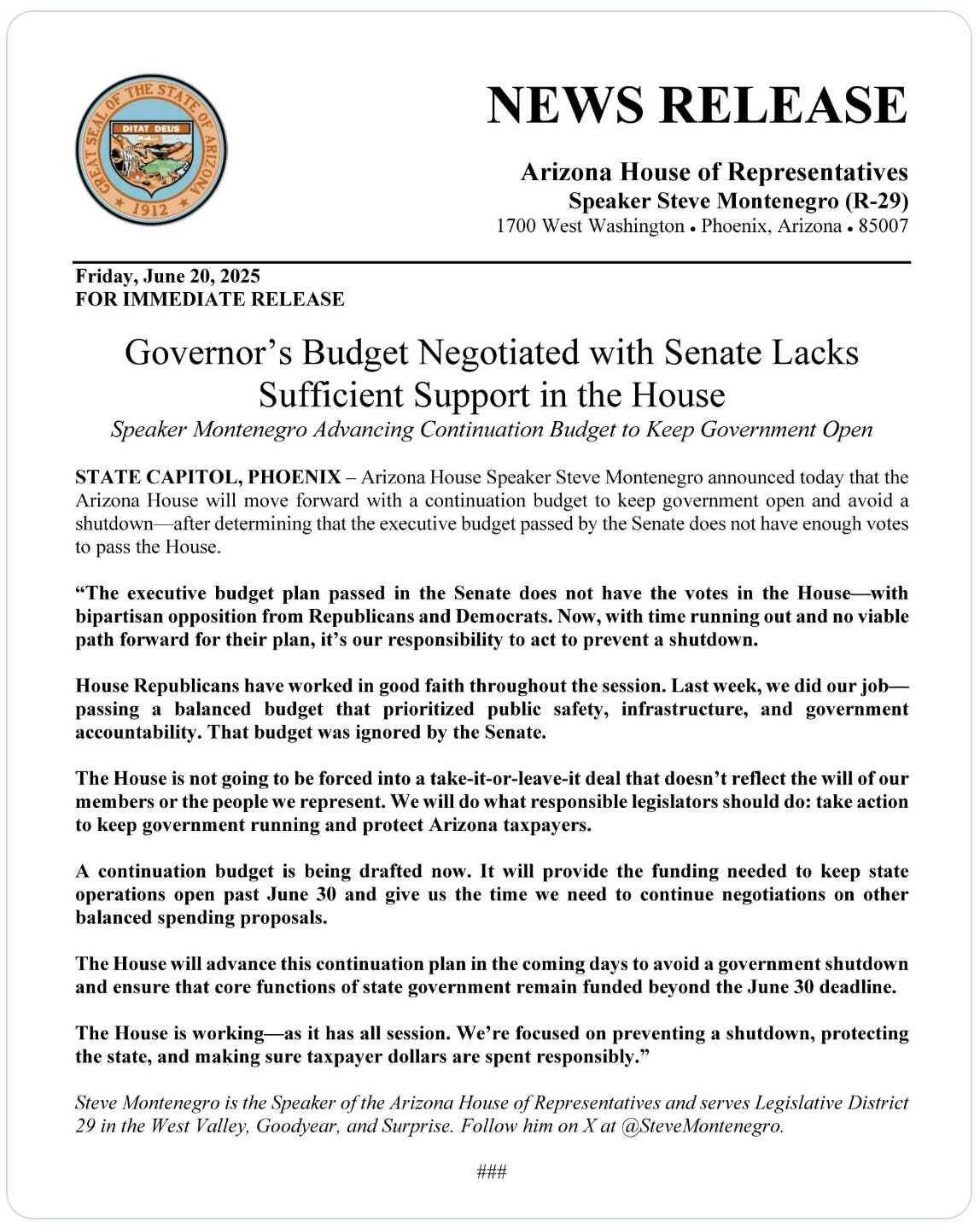 Montenegro says he doesn’t have enough votes in the House to pass the Senate budget, and the House will instead return today to pass a “continuation budget” (essentially a short-term budget with no changes in spending from the current budget) to ensure government doesn’t shut down as they negotiate past the July 1 deadline.