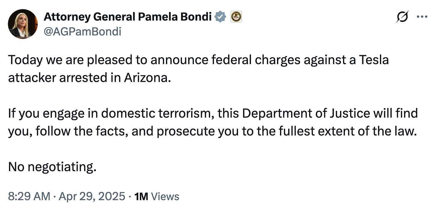 Not a terrorist: The man accused of trying to burn down a Tesla dealership in Mesa was arrested and charged in federal court, Axios’ Jessica Boehm reports. Since Tesla owner Elon Musk is buddies with President Donald Trump, Attorney General Pam Bondi took the time to post about the arrest on X, which also is owned by Musk. While Bondi called the crime “domestic terrorism,” the man was only charged with malicious damage to a vehicle by means of fire.